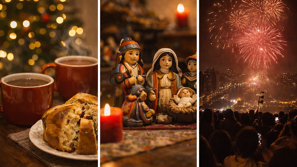 Midnight is the big moment: gifts, hugs, fireworks in many neighbourhoods, and sometimes church.